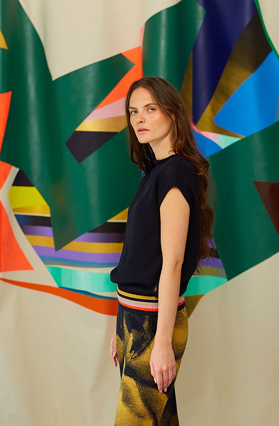 Leuchtende Farbakzente, starke grafische Elemente und raffinierte Strickdetails verschmelzen zu einem Look, der auffällt, ohne laut zu sein.