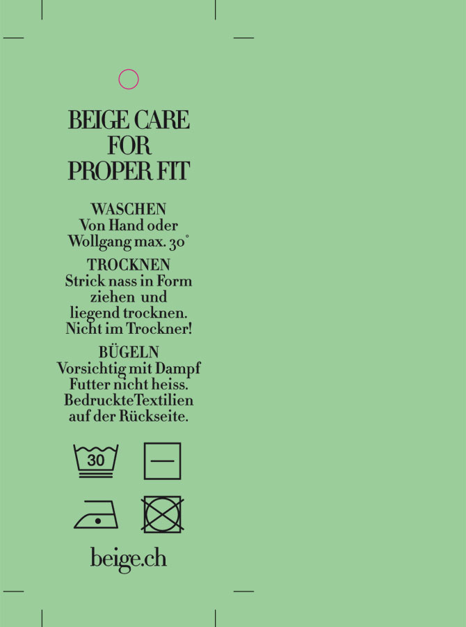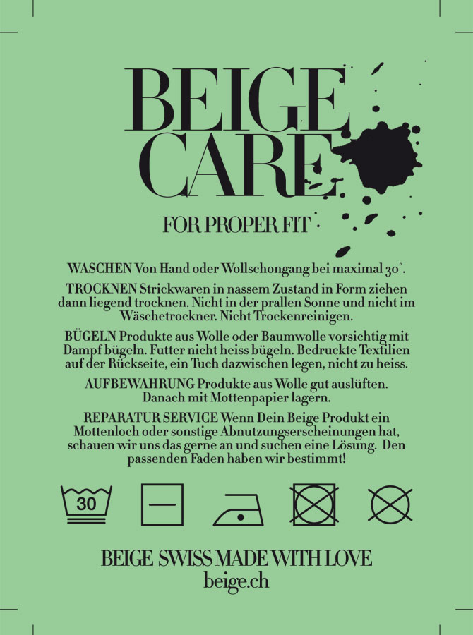 Beige Produkte bieten einen hohen Tragekomfort dank bester Qualität. Wir verwenden Garne aus natürlichen Fasern, die schonend nach unseren Vorlagen eingefärbt werden und trotzdem sind unsere Kreationen pflegeleicht. Alle Teile lassen sich im Schongang waschen und bleiben dank den verwendeten hochstehenden Materialen schön in Form.