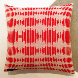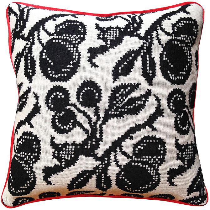 Strickkissen «Cherry» 50 x 50 cm mit seitlichem Reissverschluss, die Hülle ist waschbar. Material: 50% Merinowolle 50% Baumwolle. Farbe: natur-schwarz rot eingefasst. Schweizer Produktion.