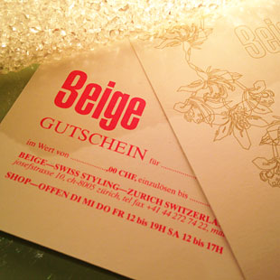 Ein Gutschein von Beige macht grosse Freude. Einlösbar bei uns im Beige Shop in Zürich an der Josefstrasse 10+15. Der Betrag ist frei wählbar.... direkt im Online-Shop bestellen oder bei uns im Geschäft erhältlich.