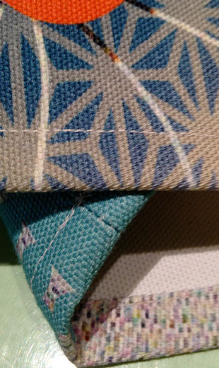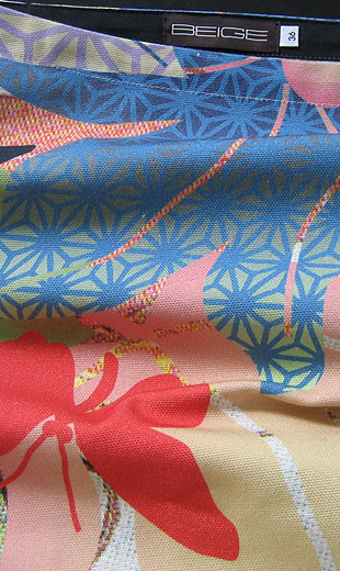 Gestrickte Schiebe- und Trennwand im Beige-Shop mit Muster «Orchid». Hocker Siebdruck auf Baumwolle.
