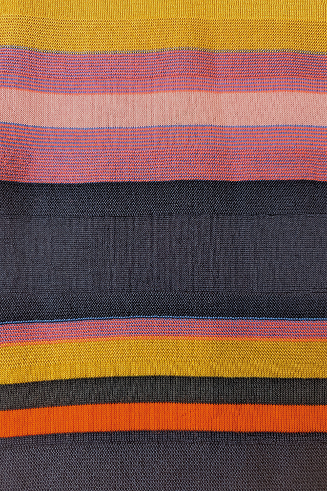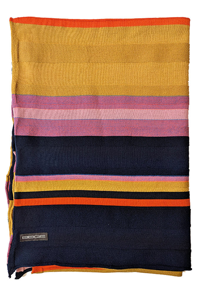 marine/ yellow ocher/ vintage pink/ juicy red95% Merinowolle, 5% Acryl Neon, fein gestricktMasse: 65 cm x 210 cmWaschen: 30° Schongangswiss made