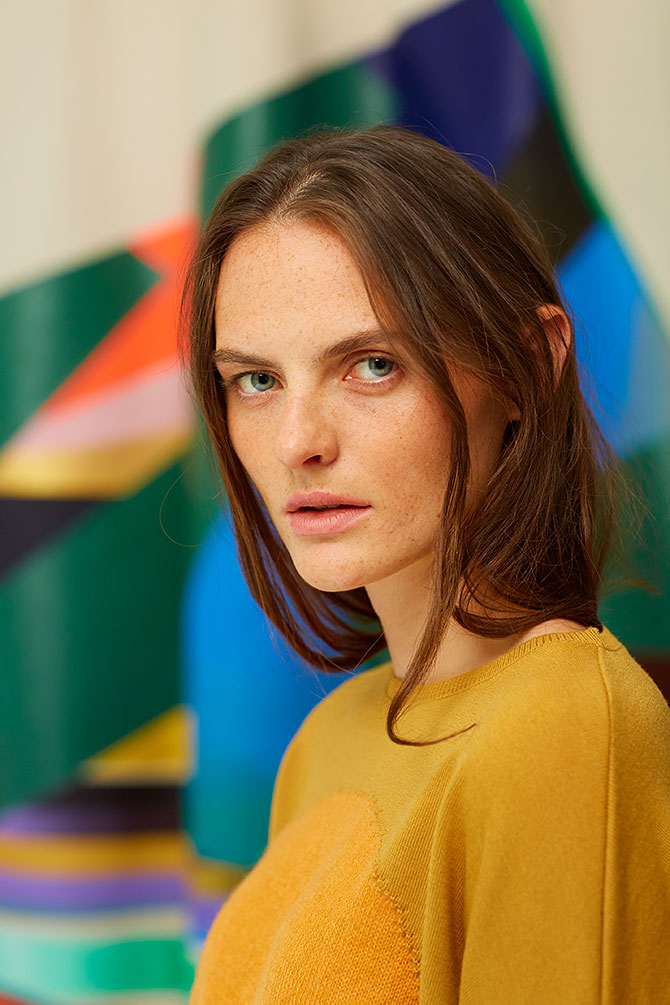 yellow ocker/ apricotRippenbord unten: 5 cm, Rippenbord bei Aermel: 8 cm95% Merinowolle, 6% Mohair, 1% PA, IntarsiastrickSwiss made