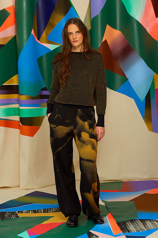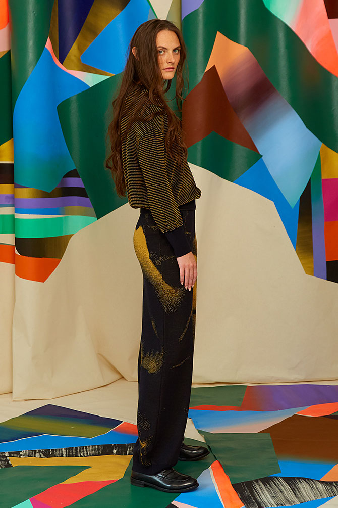schwarz/ yellow ockerAbschluss Hosenbeine: Rippenbord 3.5 cmTaille: Gummiband (4 cm) eingenäht100% Merinowolle, JacquardstrickSwiss made