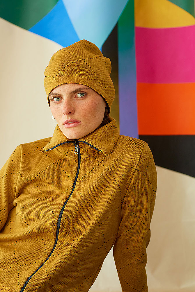 Mütze reversibelSeite 1: schwarz/ marine/ rehSeite 2: yellow ocher/ schwarzEinheitsgrösse100% Merinowolle, JaquardstrickWaschen: 30° SchongangSwiss made