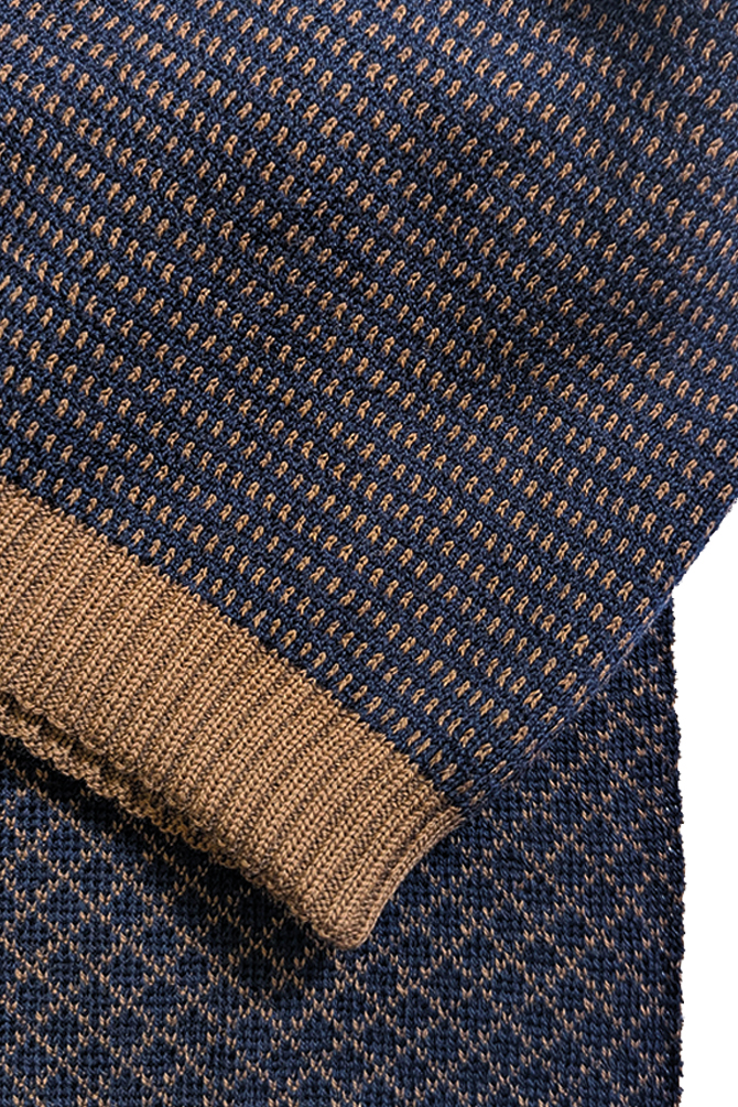 marine/ coffee, Rippenbord: yellow ocherEinheitsgrösse100% Merinowolle, JaquardstrickWaschen: 30° SchongangSwiss made