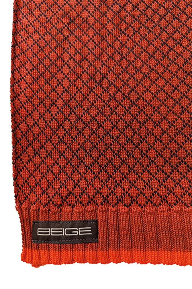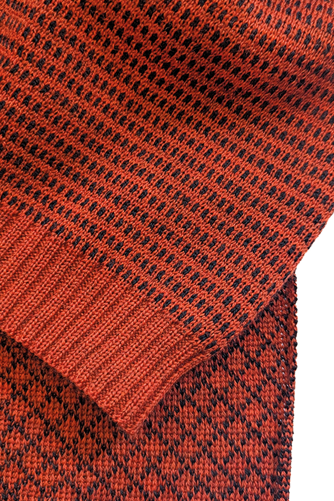 rust/ schwarz, Rippenbord: juicy redEinheitsgrösse100% Merinowolle, JaquardstrickWaschen: 30° SchongangSwiss made